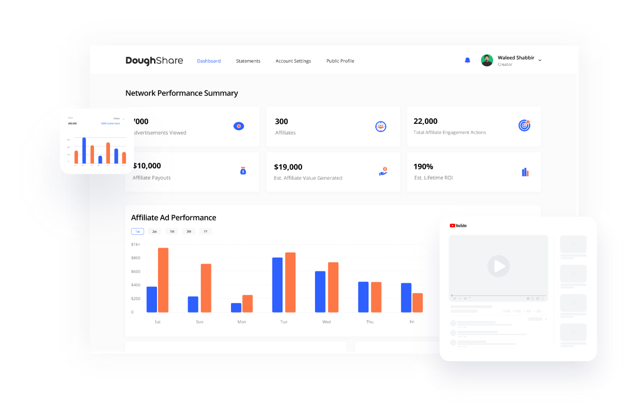 Doughshare allows Youtubers to convert viewers into affiliates who get paid for amplifiication and engagement activities